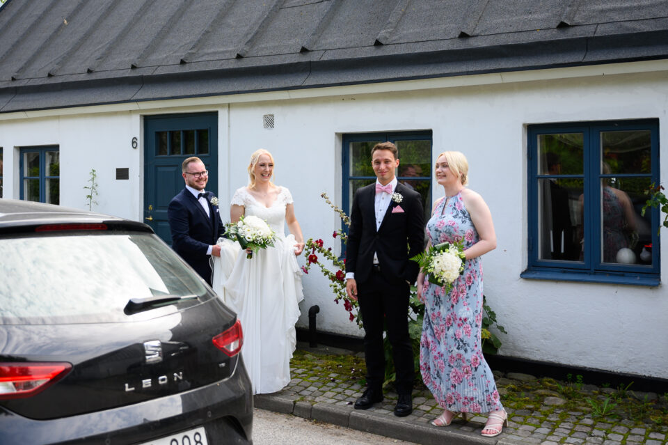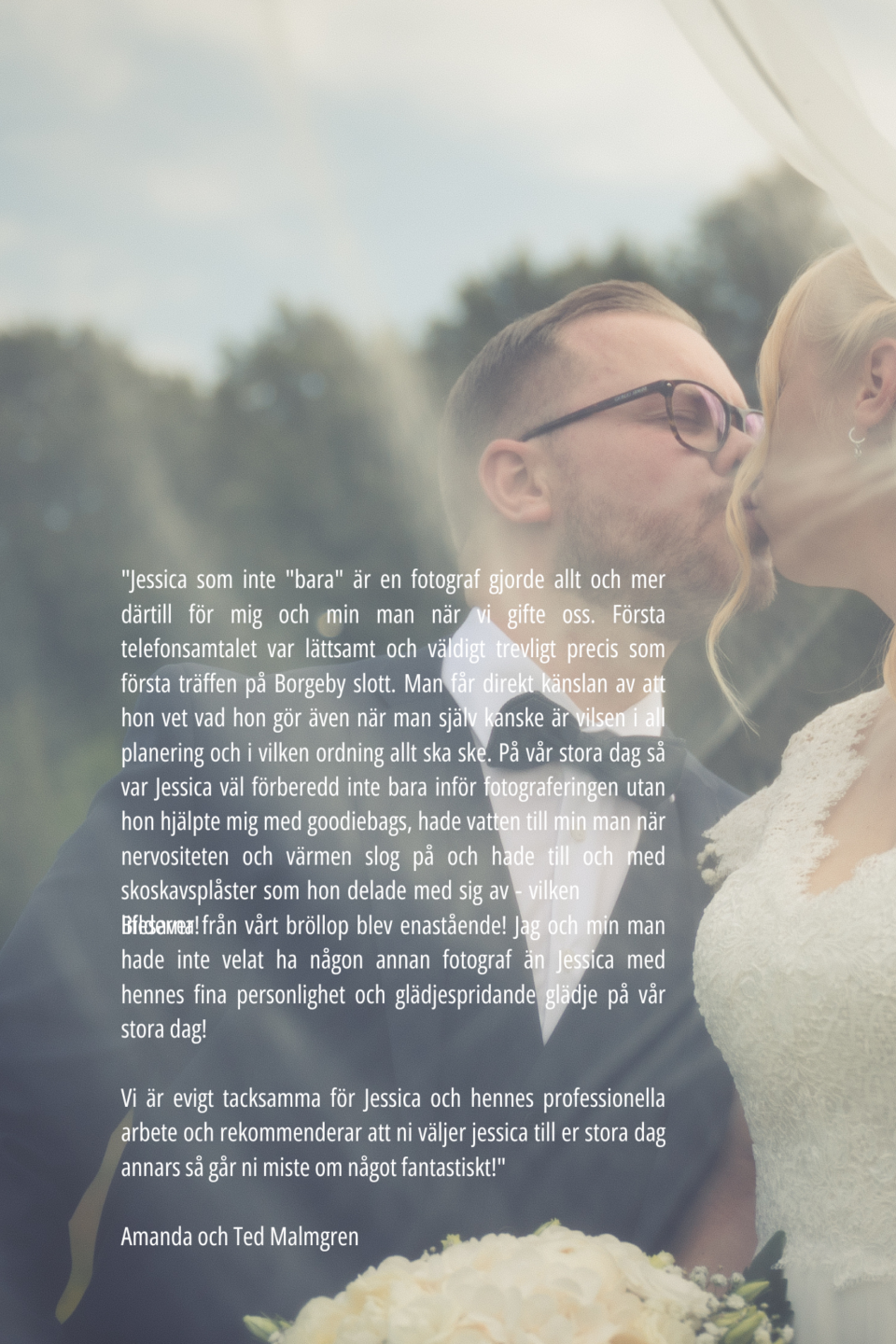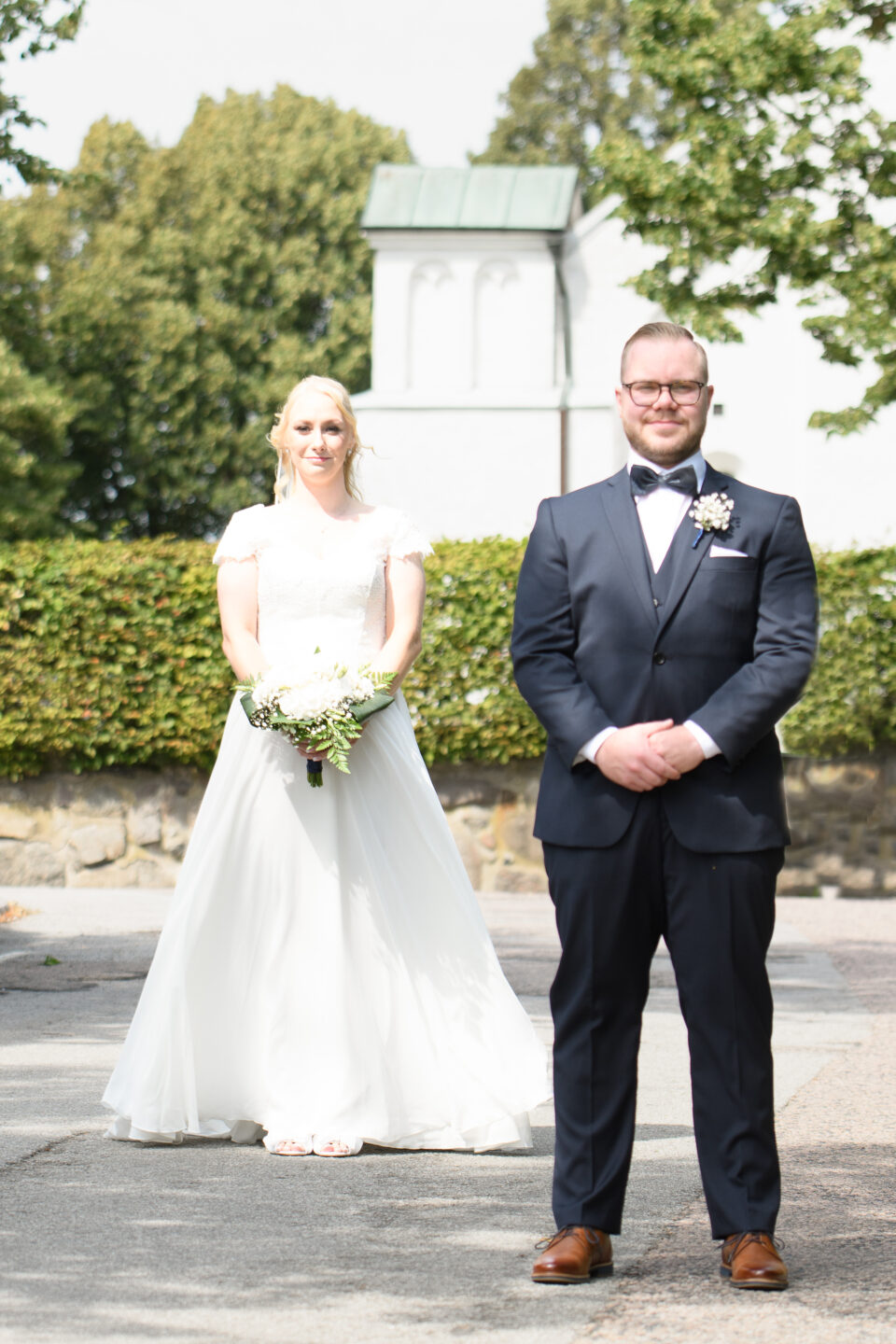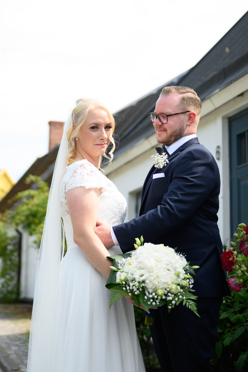Amanda och Ted, detta kärleksfulla och varma par fick jag äran att föreviga i St Råby Kyrka. Kyrkan där mina föräldrar vigdes 1972, en speciell känsla som fyllde mig med glädje och kärlek. Tänk alltså! Jag jobbar som bröllopsfotograf och fotograferar ett fantastiskt bröllop i just den kyrkan där mamma och pappa sa ja till varandra, lite overkligt. Hur som helst, jag var som vanligt, i väldigt god tid. Rekade platsen som vi bestämt för First Look, mitt på 30-vägen utanför kyrkan skulle den vara. Den lilla gatan som passerar genom St Råby är supergullig med jättefina hus och där tänkte jag att porträttfotograferingen skulle ske. Amandas brors flickvän var utsedd till tärna och Amandas bror bestman. Tärna och bestman hade det stora uppdraget att vara trafikvakter, det kör ju trots allt bilar där även om det är en liten gata. Det blev en hel del tutande och hejarop från passerande bilar och vi skrattade gott åt spektaklet som fotografen ställt till med. Efter vigseln åkte vi till Dalby där festen skulle hållas. Härliga gruppbilder blev det med familj och vänner. Regnet hängde i luften och när det var dags för mig att dra mig därifrån och gästerna gick in i tältet, då öppnade sig himlen och det regnade enorma mängder. Men, wow – vilken dag jag fick dela med detta fantastiska brudpar.