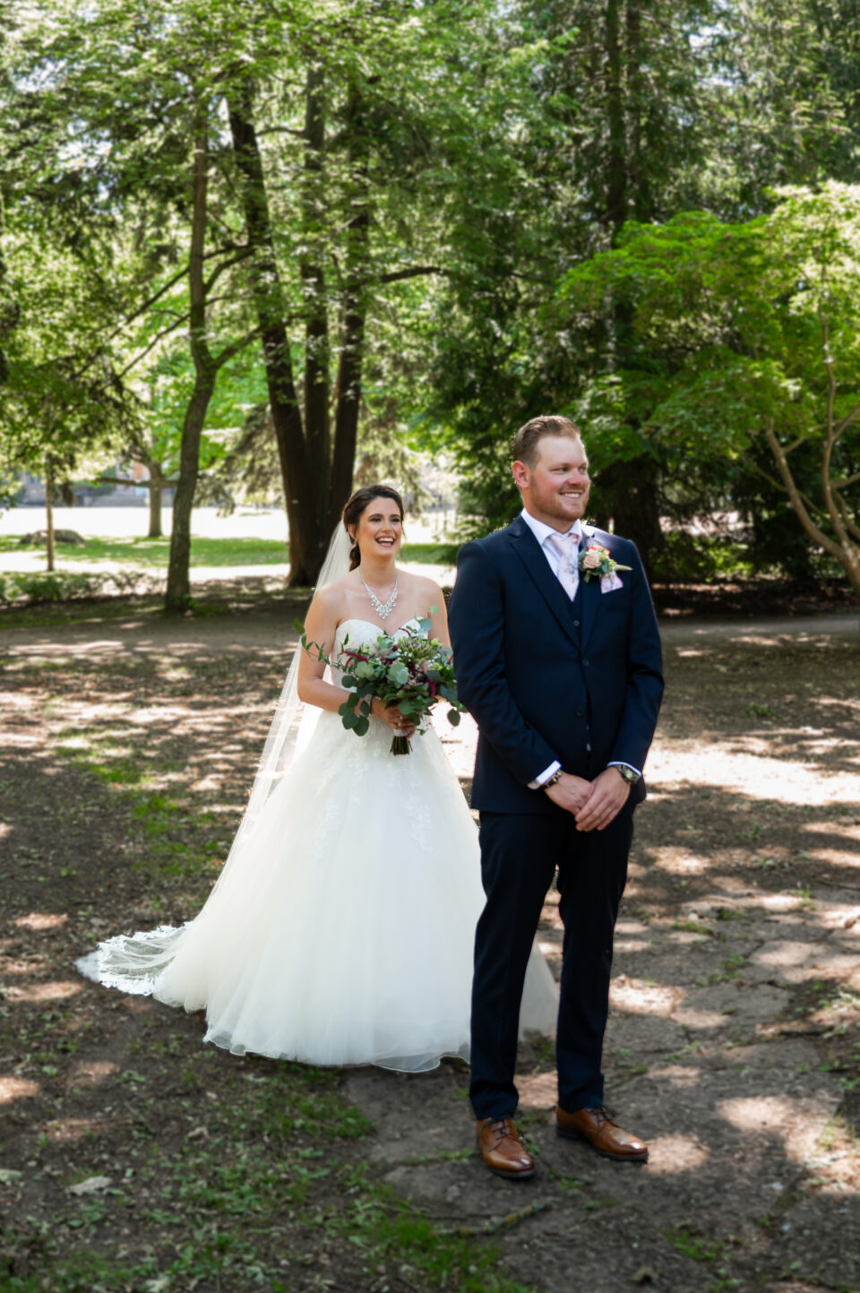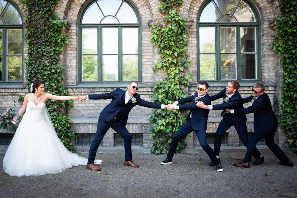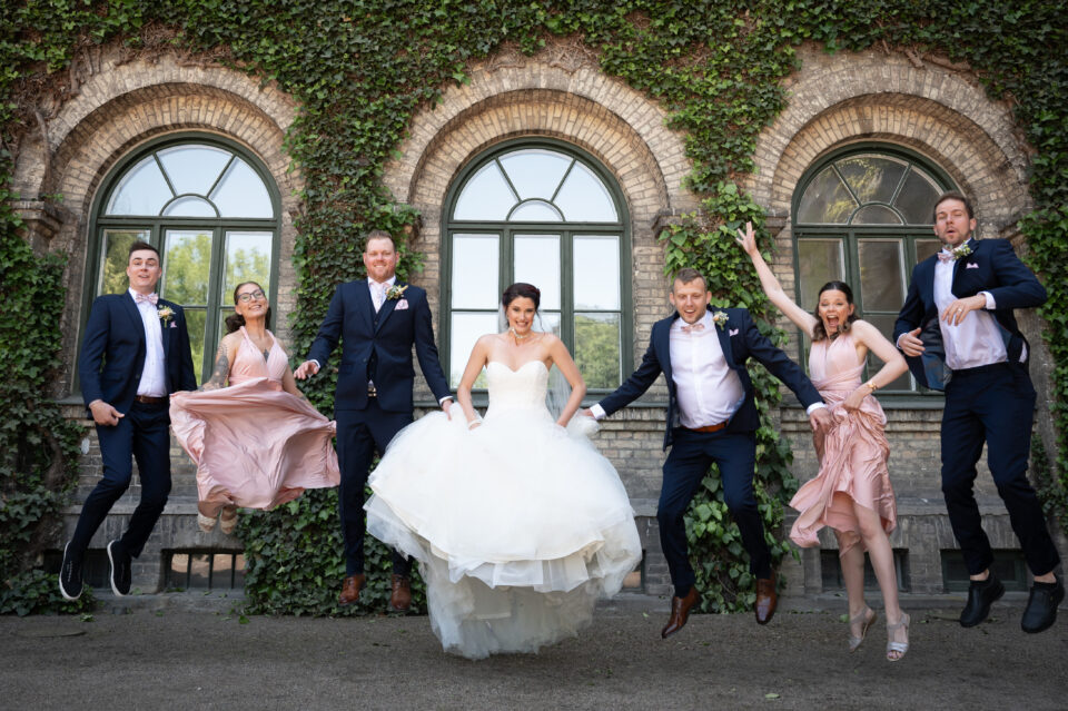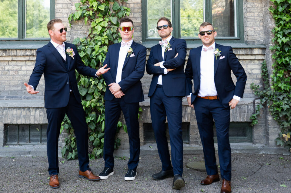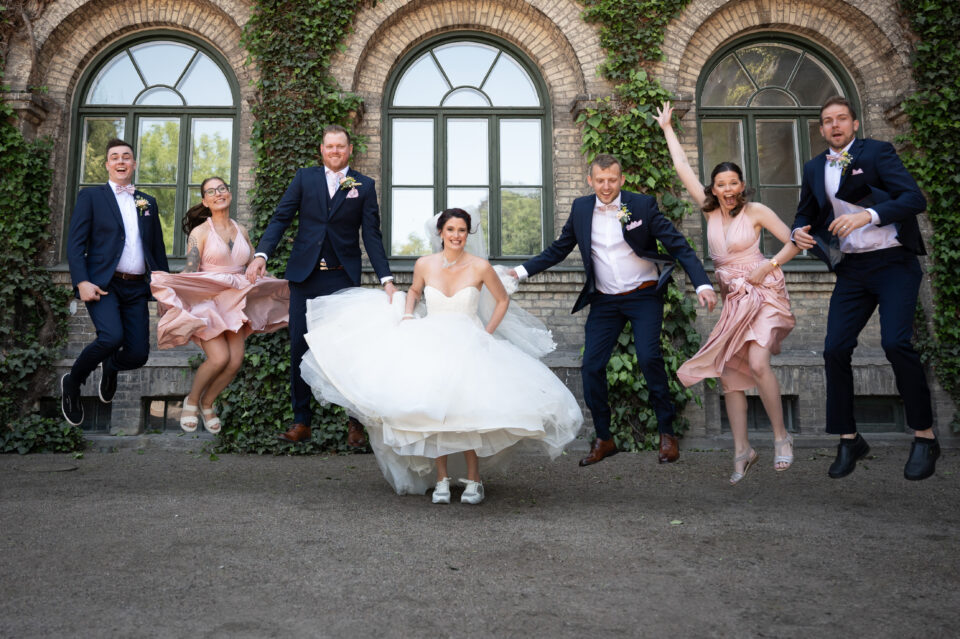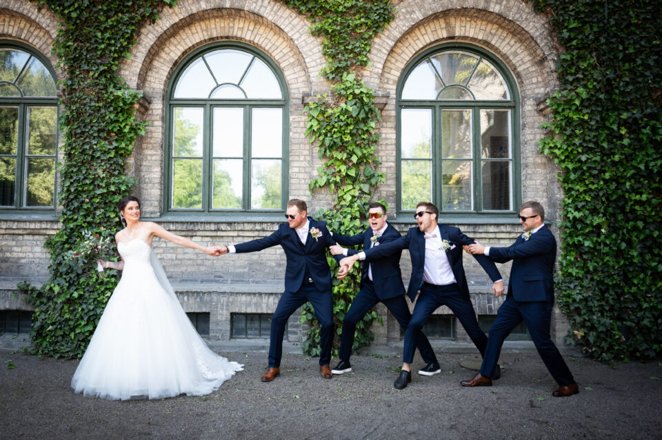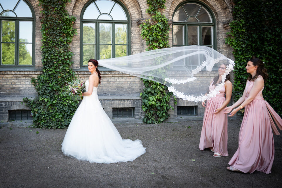 Hur viker man näsduken som ska vara i kavajfickan? Bra fråga! Detta var vad vi sysslade med innan bruden och hennes tärnor dök upp. En brudgum och tre marskalkar med näsdukar vikta på nästan samma sätt, men vem tänkte på det? En varm och solig sommardag med porträttfotografering i Alnarpsparken och jag var så glad över att vi var just där den dagen. För i Alnarpsparken finns naturliga skuggpartier överallt. First look och sedan tog vi oss runt i parken på de ställen som vi sett ut några veckor tidigare när vi sågs för provfotografering och genomgång av schema. En lättsam fotografering (lättsam är min mammas uttryck och jag älskar det) med brudpar och deras närmaste vänner, vi fann varandra och kunde slappna av tillsammans. Bilderna visar just det! En vacker vigsel i Bergakyrkan utförd av Madeleine Körner, underhållningen stod de två söta näbbarna Agnes och Thea för. Porträttfotografering med följe i Bergaparken innan vi körde mot Storegård i Fjelie där festen skulle hållas.