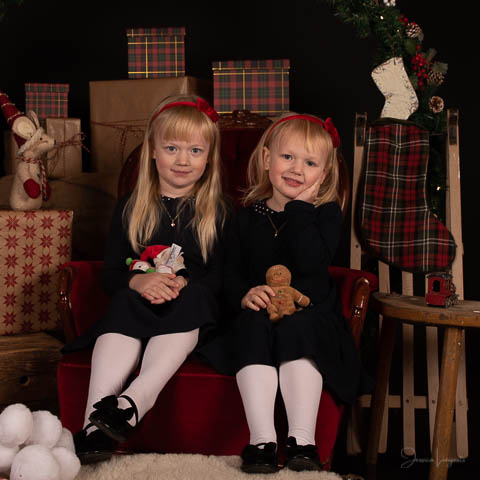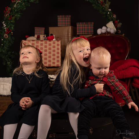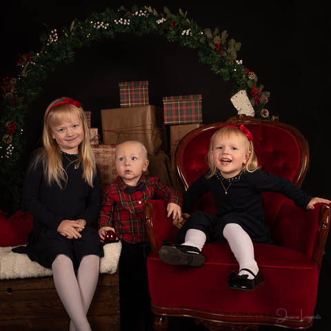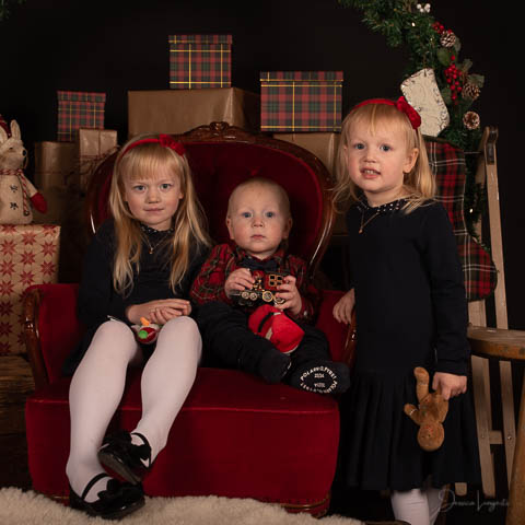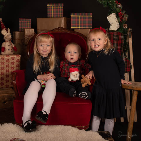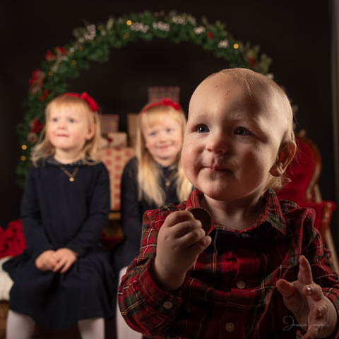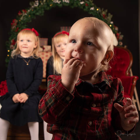 Julkortsfotografering med två flickor som med stor tydlighet visade att dom gjort detta tidigare. Lille Gustav däremot – han hade inte påbörjat sin modellkarriär ännu. Det ska vara en första gång för allt, här blev det både modellande och chokladätande…..