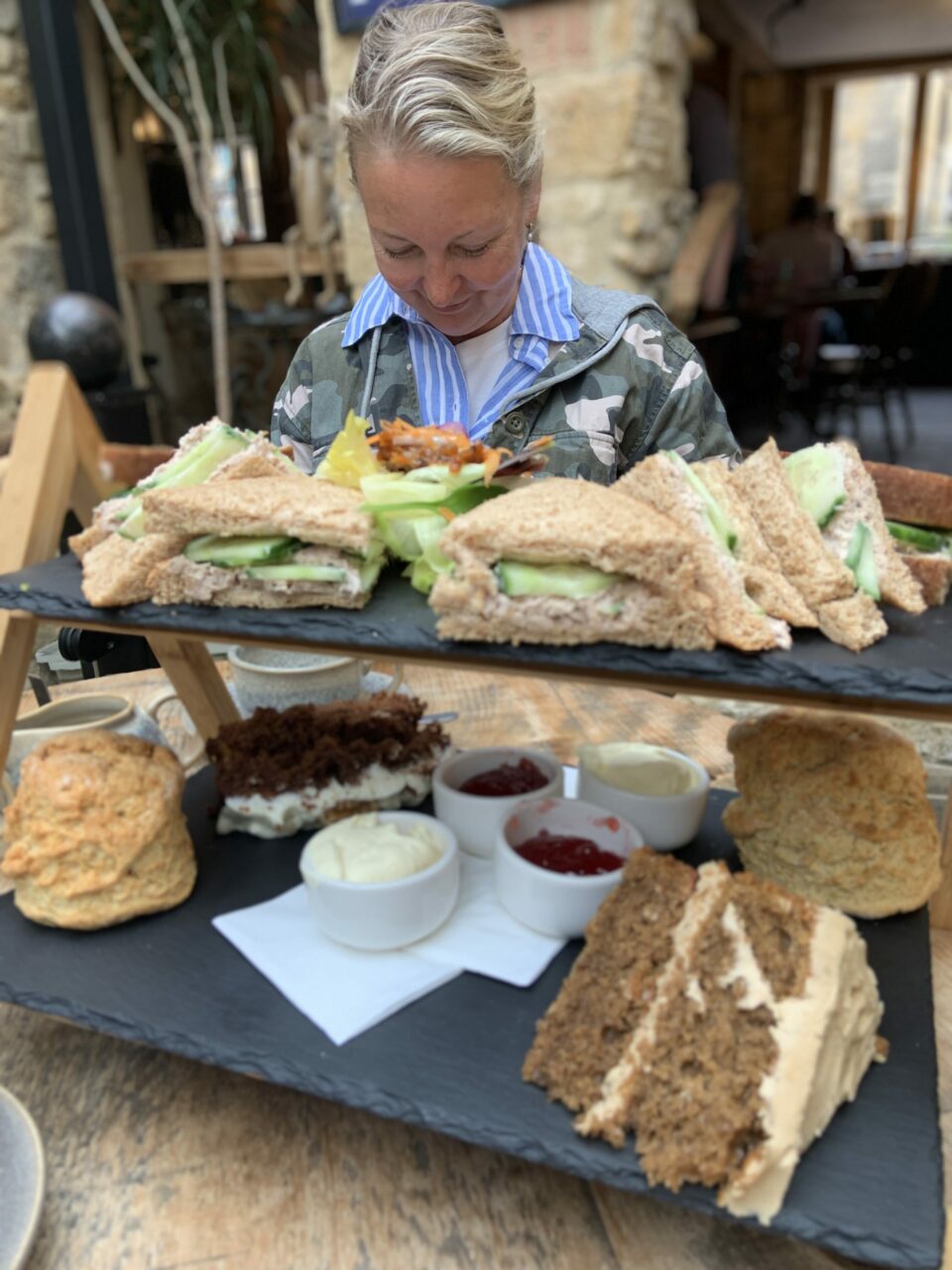 Efter en fantastisk middag i Lords of The Manors restaurang, en god natts sömn och engelsk frukost kom den bokade taxin och vi begav oss mot vårt spa där vi skulle spendera de två sista nätterna. I våra huvuden hade vi bokat spa långt ut på landet, med fälten som närmsta granne. Så fel vi hade 🙂 Taxin tog oss till en liten by, parkerade bilen på en ganska central parkering och sa nu är vi framme. Nix pix sa vi, det måste vara fel – vi ska bo på landet. Taxichauffören tittade på oss, sedan på bokningen, gick ut till närliggande hus, tittade på skylten och kom tillbaka till bilen. “Alltså, det är här ni ska bo” What?! Men, jo det var ju helt rätt. Cotswold House Hotel & Spa i Chipping Campden var det vi bokat, men bilderna vi gått efter var tagna från baksidan av hotellet och där kunde man se grönskan…. Vi hade inte uppfattat att det var i en by vi skulle bo, men oj vilket ställe! Vårt rum visade sig vara ett litet gårdshus, så otroligt mysigt. Byn Chipping Camden var helt underbar med små butiker, caféer och restauranger. Efter en stunds promenerande i denna vackra by gick vi in på The Bantam Tea Rooms för Afternoon tea. Scones, kakor, clotted cream och marmelad – mums! Mätta och belåtna promenerade vi därefter på måfå och kom upp till St James Church. Vi hade bokat bord till kl 20 i hotellets restaurang, men när vi väl kom dit så fanns det inget bord till oss. Så…. personalen dukade upp vid ett fönsterbord i en egen sal bara för oss två. God mat och gott vin sen var det tacksamt att få lägga huvudet på kudden i vårt lilla gårdshus.