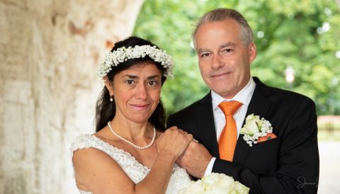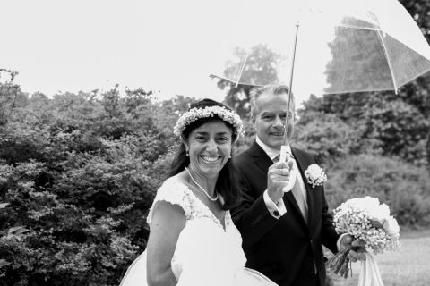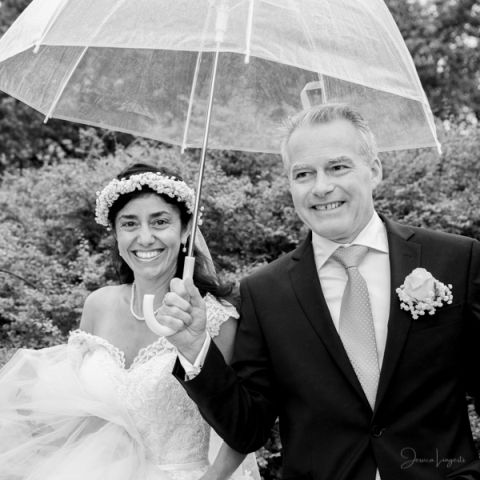 I hällande ösregn blev Deniz och Geoffrey man och fru. Porträttfotograferingen hade vi delvis i Borgeby Slottspark, men även i logen där jag riggat upp med studiobelysning. De genomskinliga paraplyerna kom väl till pass.