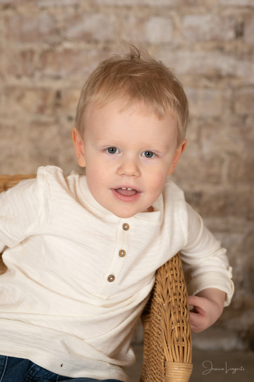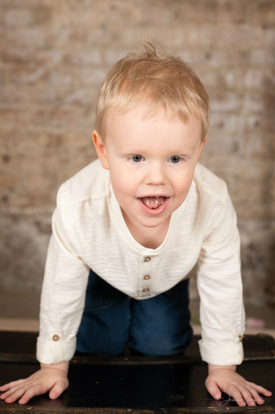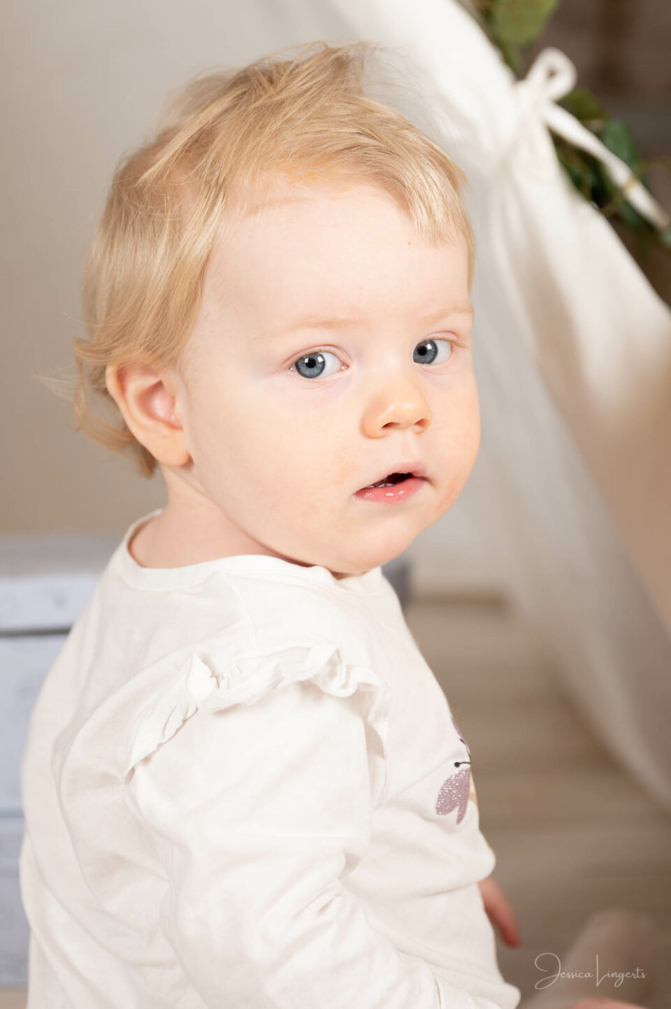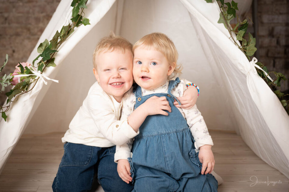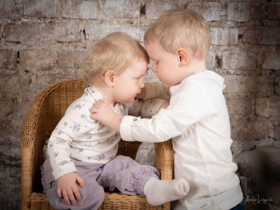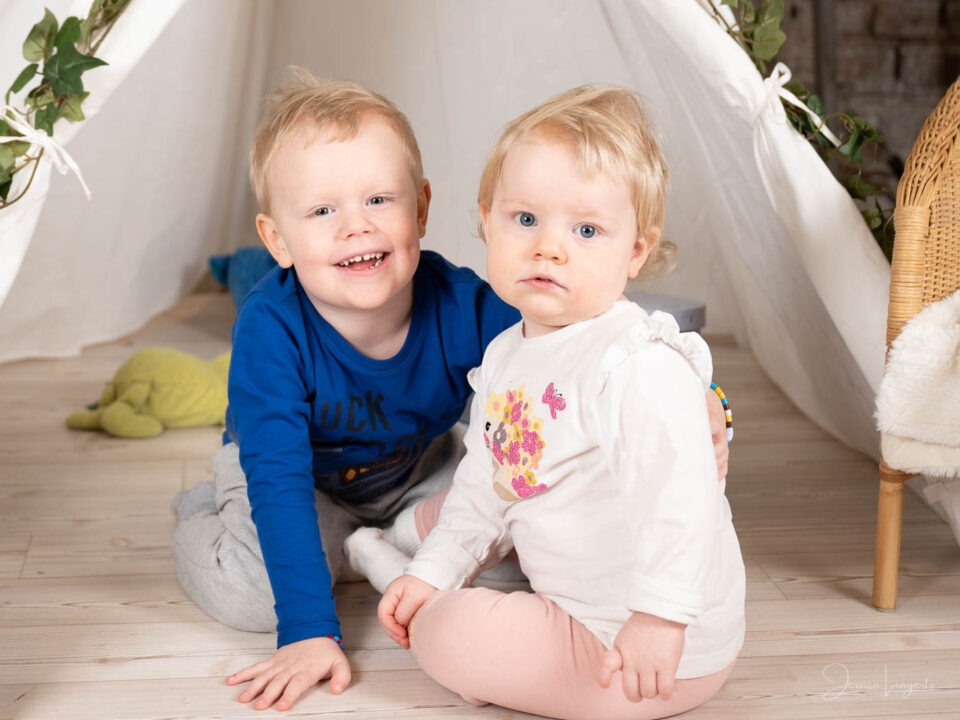 Premiärfotografering i min nya studio! Det är, inte helt otippat den vackra tegelväggen som kommer att agera bakgrund på de flesta bilder framöver. Ellen och Oscar lekte i tipitältet, klättrade på den gamla resväskan och luktade på mina nyinköpta plastblommor som doftade underbart tydligen *haha*. Föräldrarna hade med sig ett ombyte kläder till barnen och det hann vi med utan några som helst problem. Äntligen är jag igång!