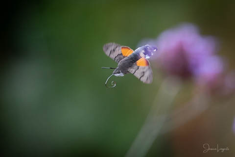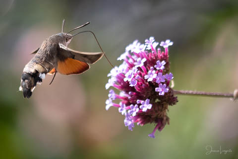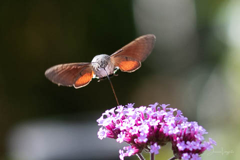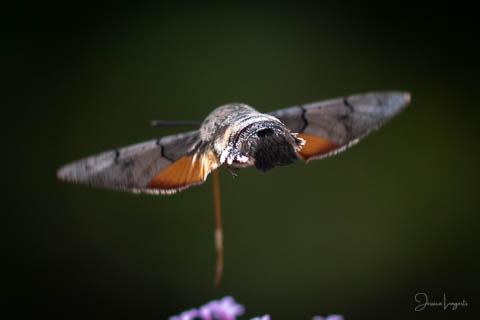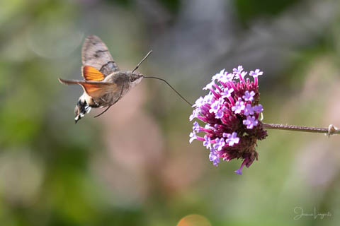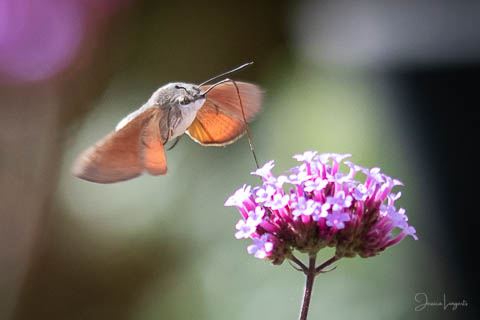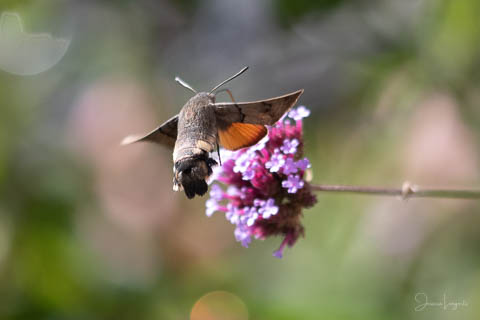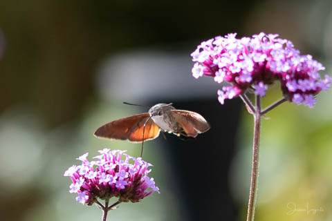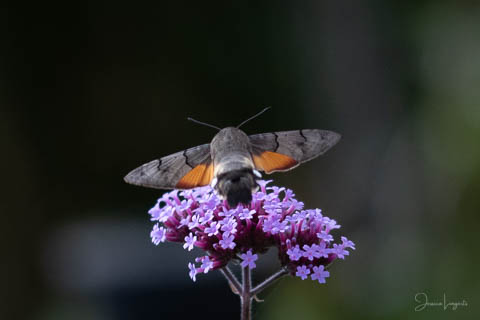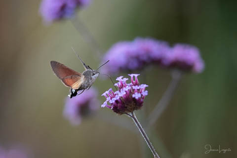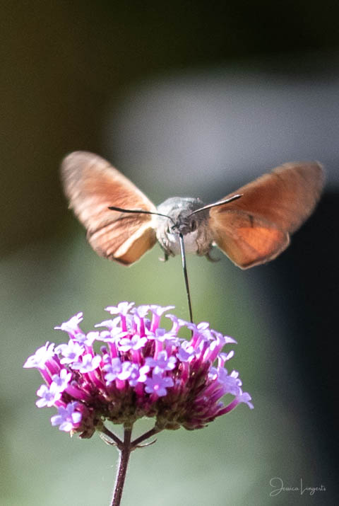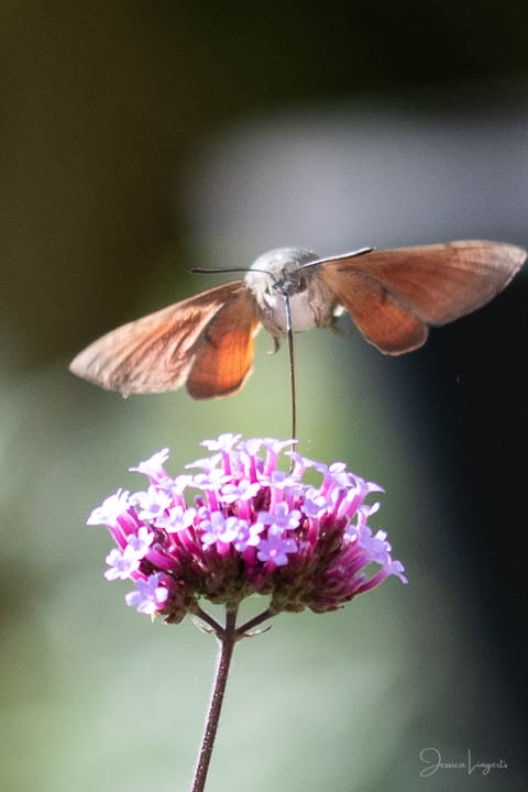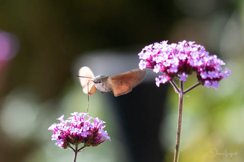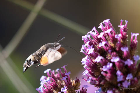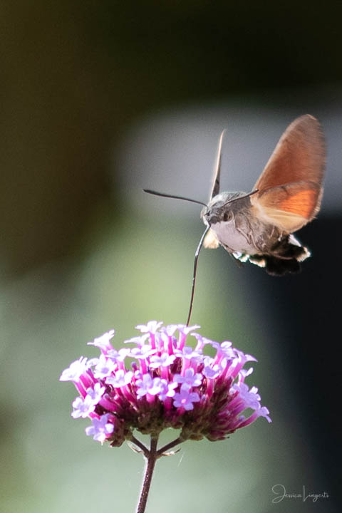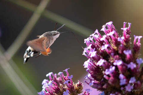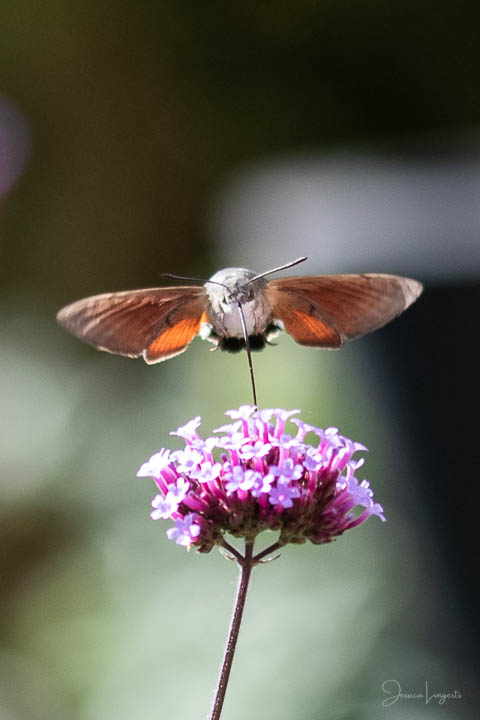 Under sommaren har jag förundrats över hur mycket fjärilar, humlor och bin som flockats runt mina Jätteverbena. En växt jag aldrig trodde att jag skulle ha i trädgården, men när min fina floristvän Tina @blomsterfen sa “ska du inte ha några?” så var ju valet plötsligt självklart. Lila är inte riktigt min färg – men wow – jag älskar verkligen dessa. Ok, mest för insekternas skull då men växten är ju fin den också. Vid ett par tillfällen har det bland andra surrande insekter dykt upp en häftig kompis, en Större Dagsvärmare. Jag hade aldrig någonsin tidigare skådat en sådan, bara sett på bild i grupper som tex “Vi som gillar fjärilar” på Facebook. För några veckor sedan när jag satt mig ner för att äta lunch i soffan på uteplatsen så plötsligt fick jag syn på en jättestor fluga, eller va 17 är det där…..? Oj wow!!!!! Sprang in efter min kamera och jodå, mycket riktigt där satt – nej, fel ordval – där vimsade en Större Dagsvärmare bland mina verbenor! Jippie! Jag lyckades se och fota denna coola varelse. 12.45 var klockan då, andra gången jag såg den var klockan runt 13 och idag – alltså, jag tror inte på slumpen…. 12.45 sätter jag mig ner i soffan på uteplatsen tillsammans med min fyrbente följeslagare, lunchen i en skål, telefonen och givetvis kameran och så säger jag till Elsa (min fyrbente följeslagare) “jaha du Elsa, då får vi se om den där jätteinsekten dyker upp idag då”. Jag hann bara säga orden så kommer den flygande i högsta fart mot verbenan. Idag blev det många bilder, men det gäller att vara på hugget – för den är galet snabb.