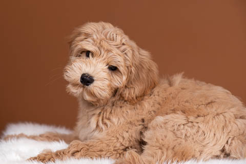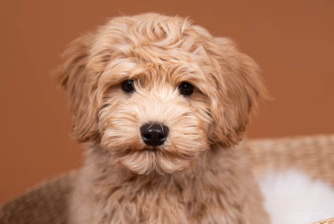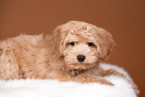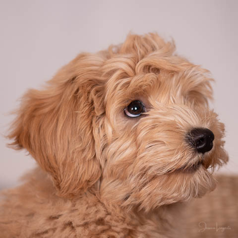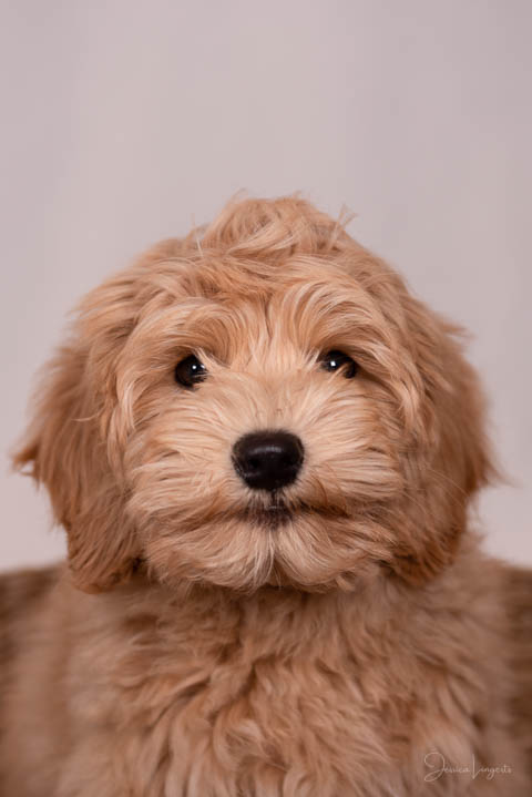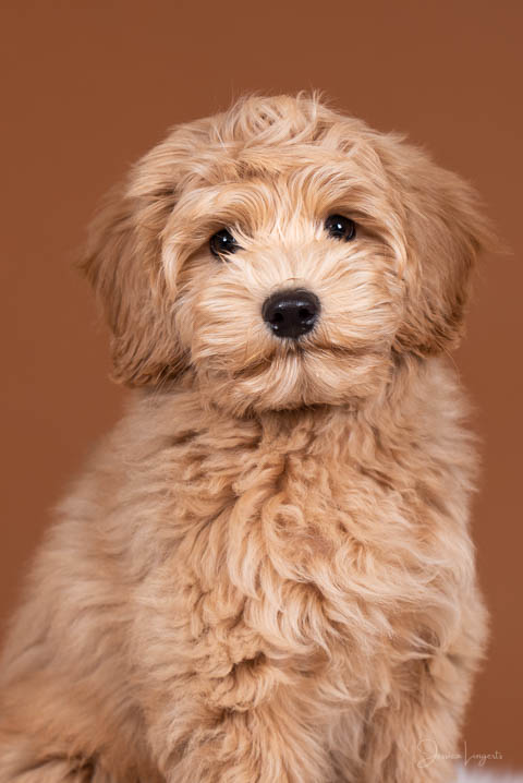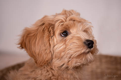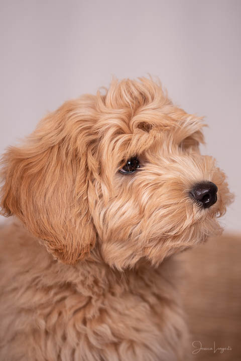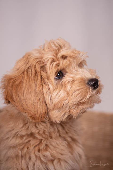 En konjaksfärgad Cockerpoo vid namn Enzo besökte studion.