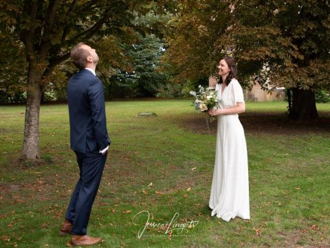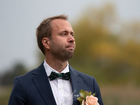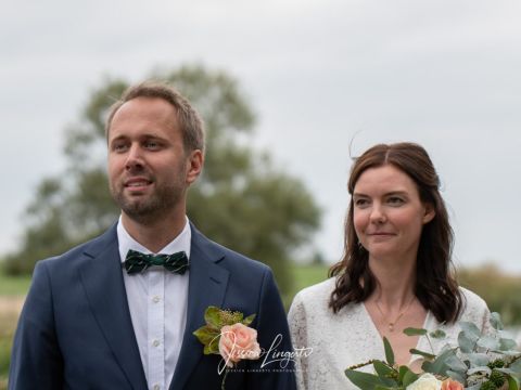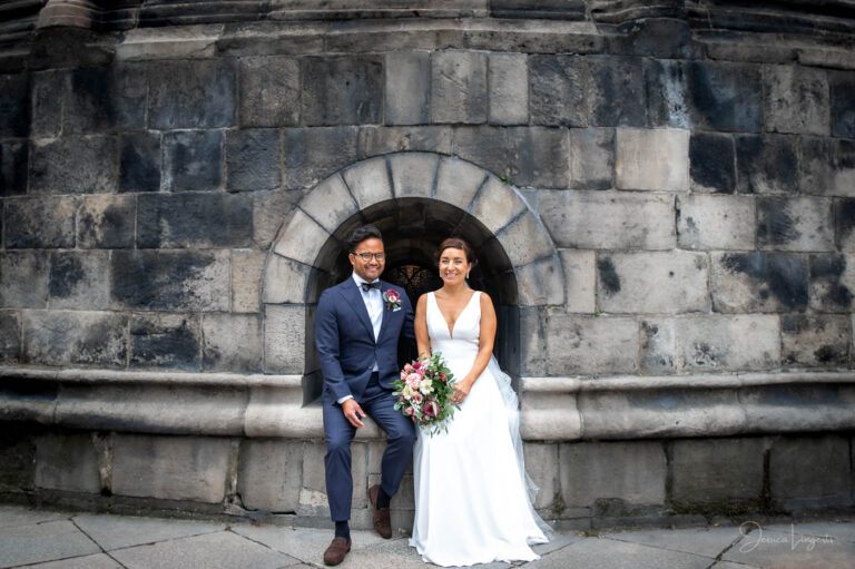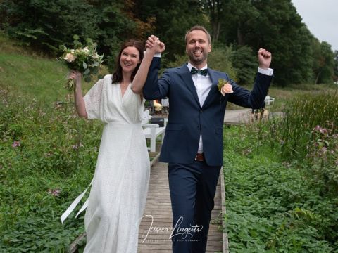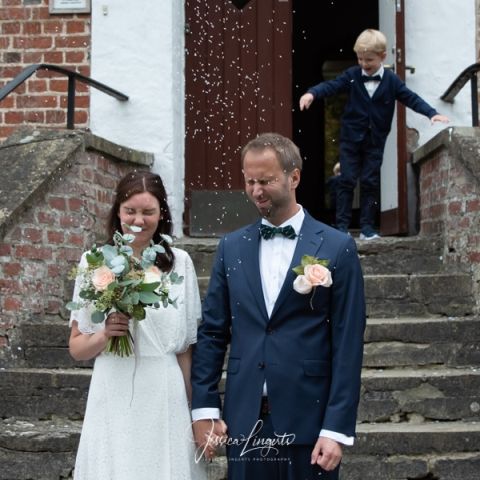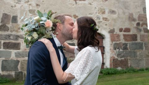 Gulliga Hanna och Marcus valde att ha sin porträttfotografering och vigsel på Borgeby Slott. Hanna var först hos Salong Sigill och fick sitt hår uppsatt, under tiden skapade Blomsterfén en vacker brudbukett och corsage till Marcus