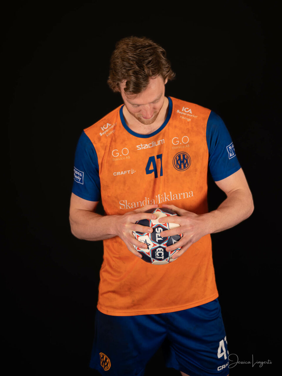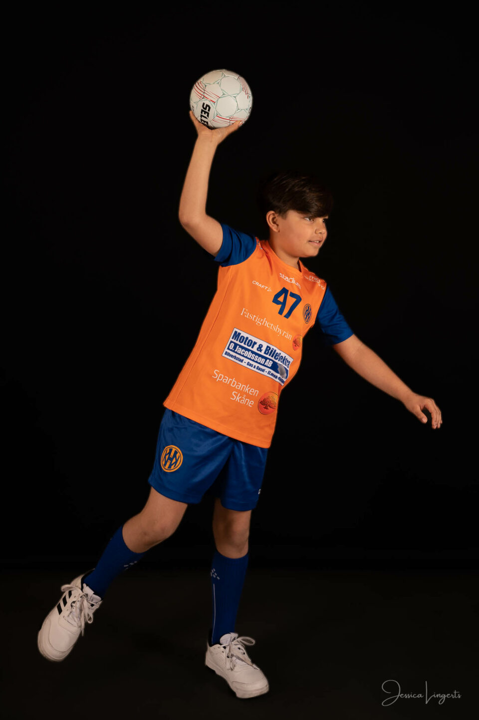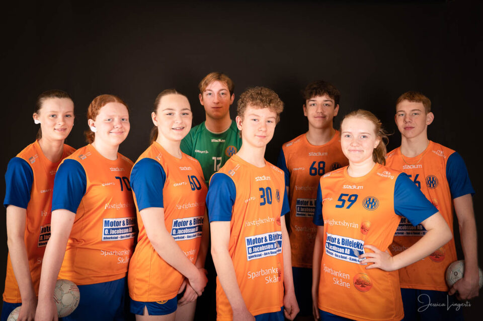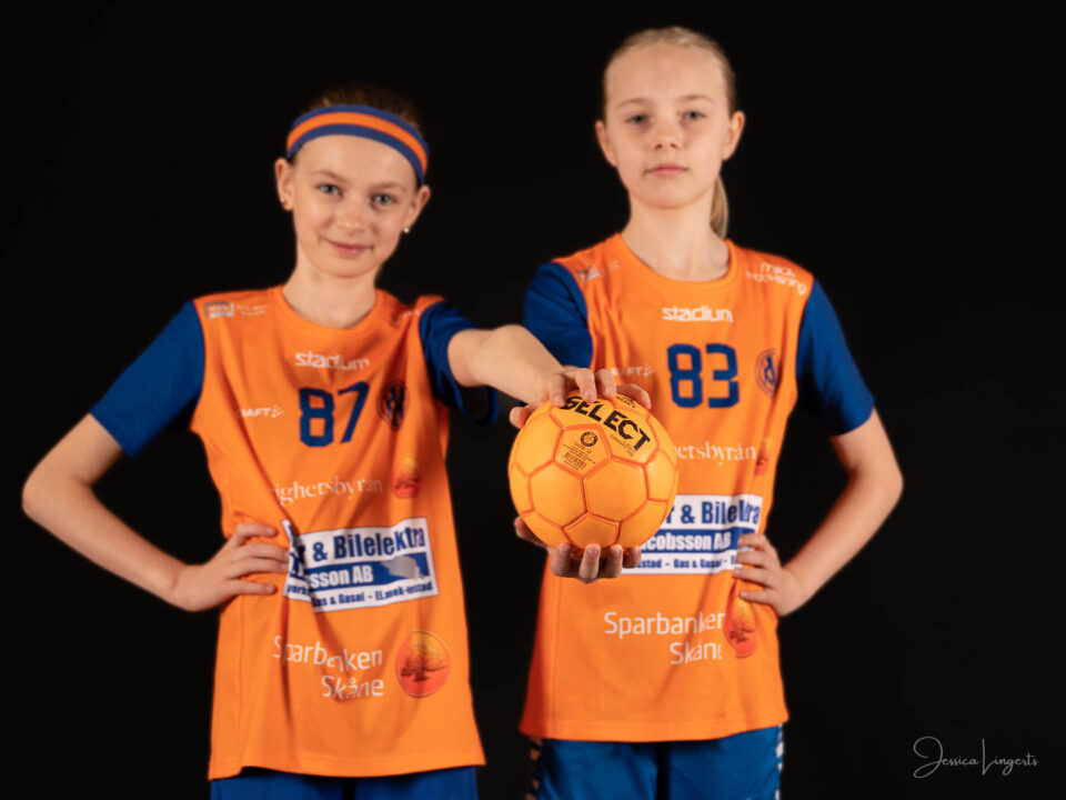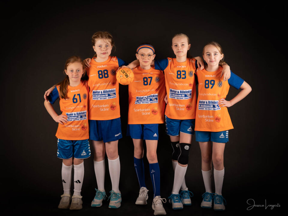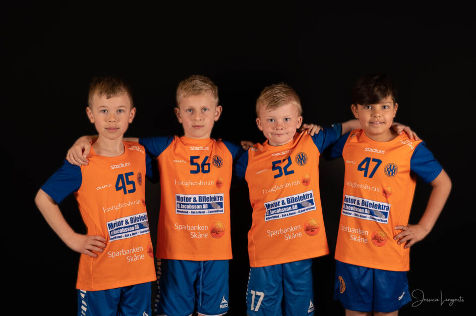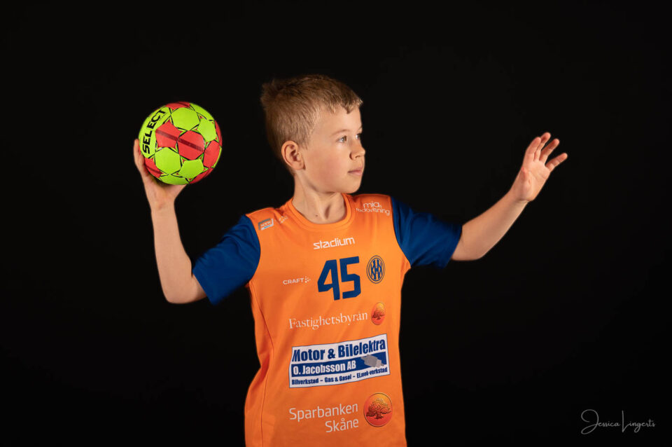 Det började med några små killar från bollskolan, en handfull orangeklädda barn med små bollar. Det slutade med att hela min ateljé var knökfull av spelare från tre äpplen höga till de som var över två meter, ledare, föräldrar, bollar och kläder. Jag klättrade upp och ner för min stege beroende på vem som skulle stå framför kameran. Av alla spelare och alla bollar som var i rörelse så var det endast en boll som testade om min skärmvägg med tavlor höll, det gjorde den. Vilken härlig dag vi hade! Tack för ett mycket roligt uppdrag KHK och sponsoransvarig Mattias Olsson.