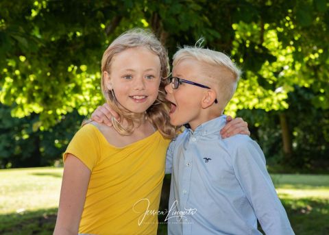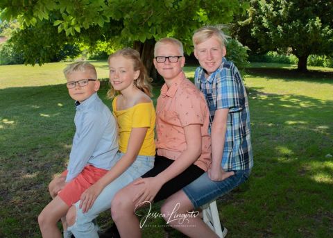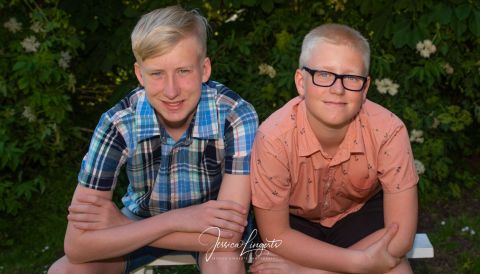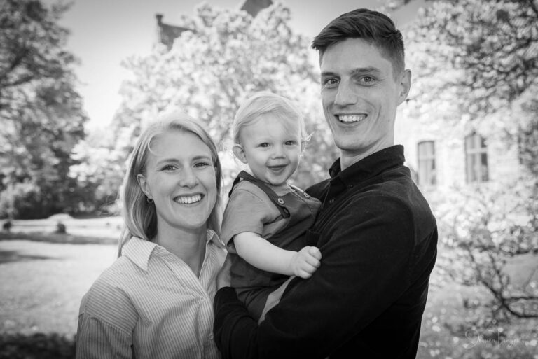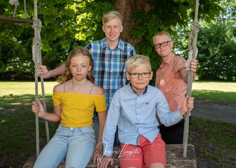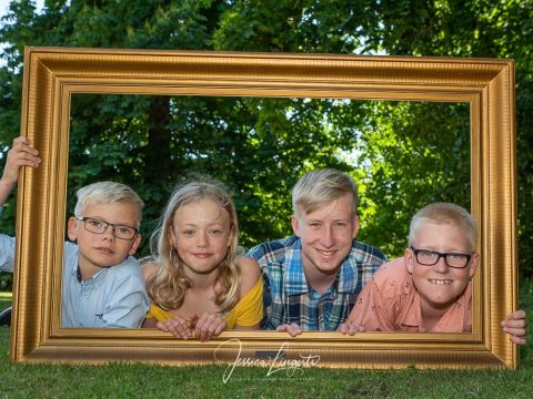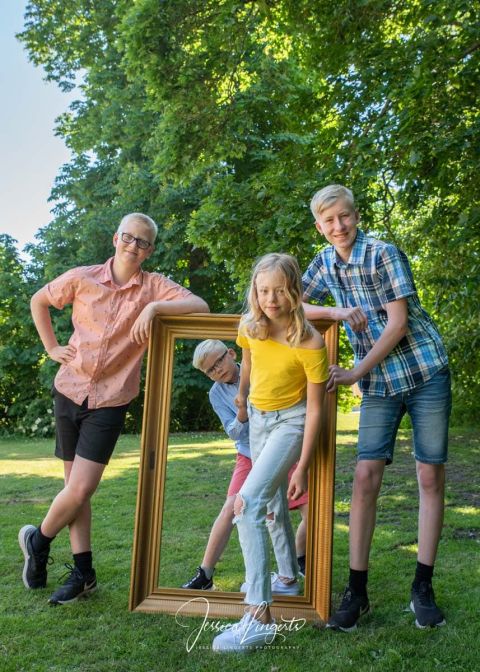 Kusinerna Junholt sammanstrålade för fotografering i Borgeby Slottspark. Min gamla ram är en uppskattad rekvisita som roar både gamla och unga.