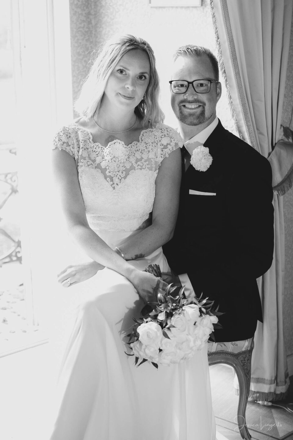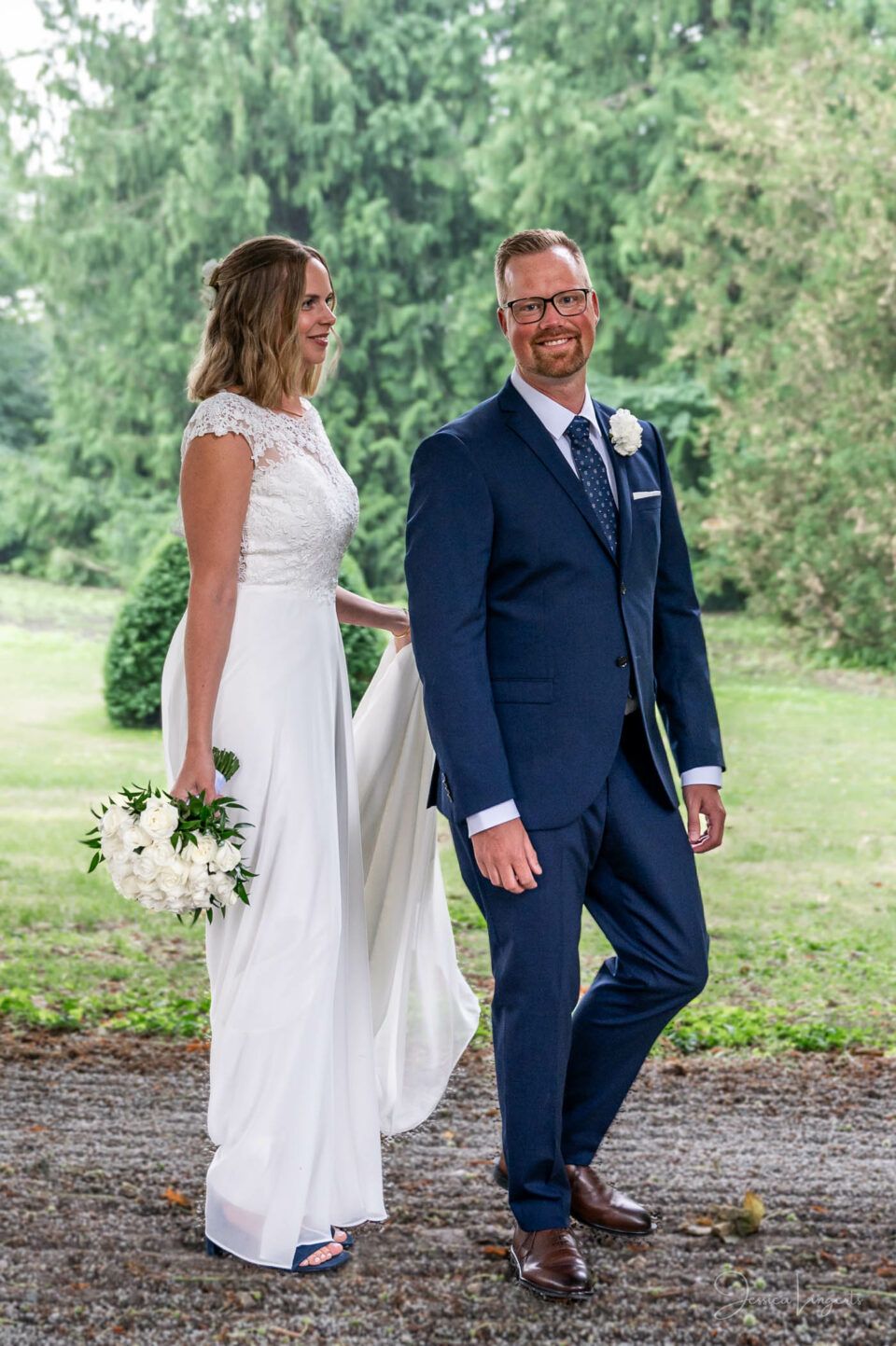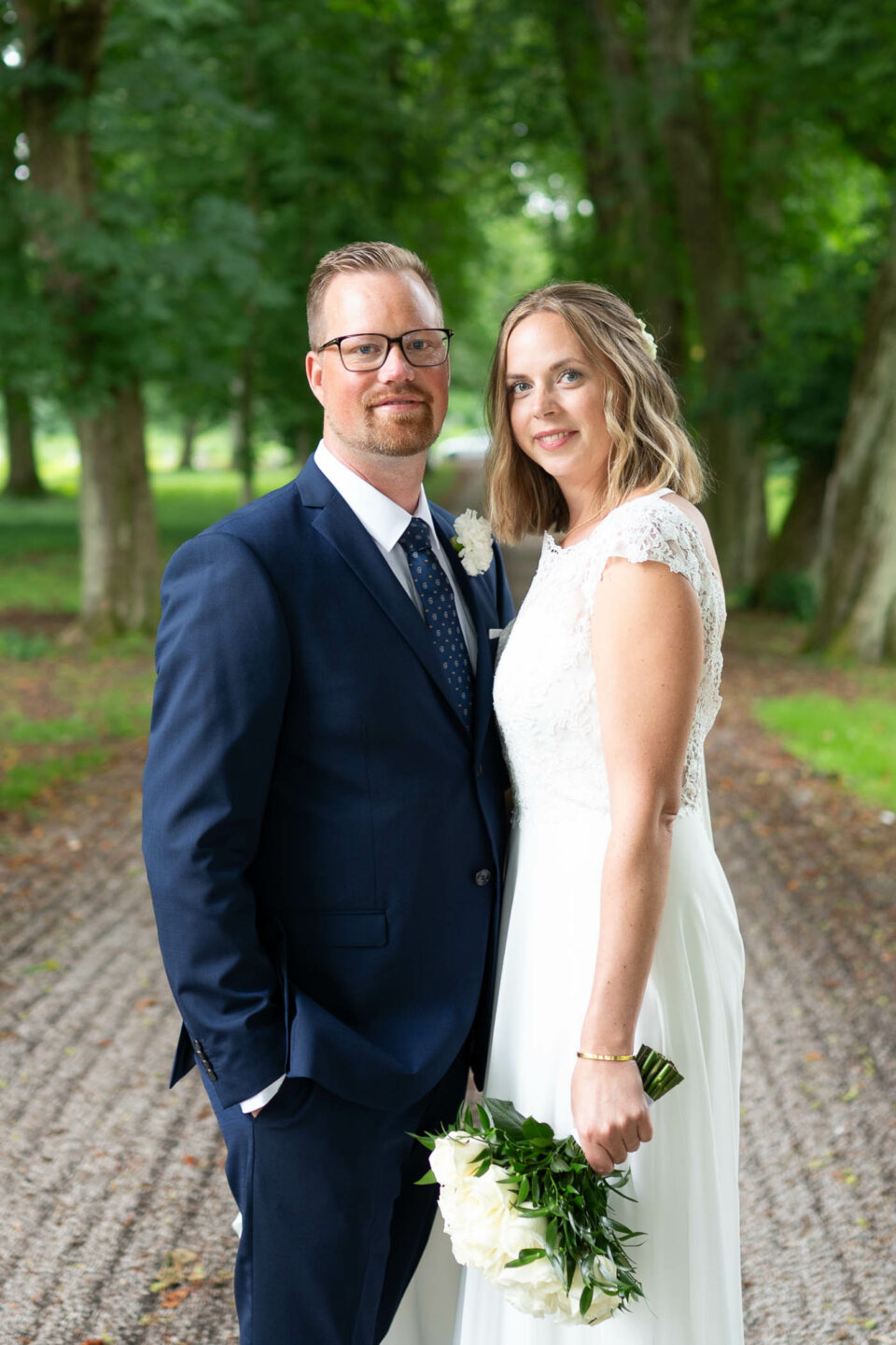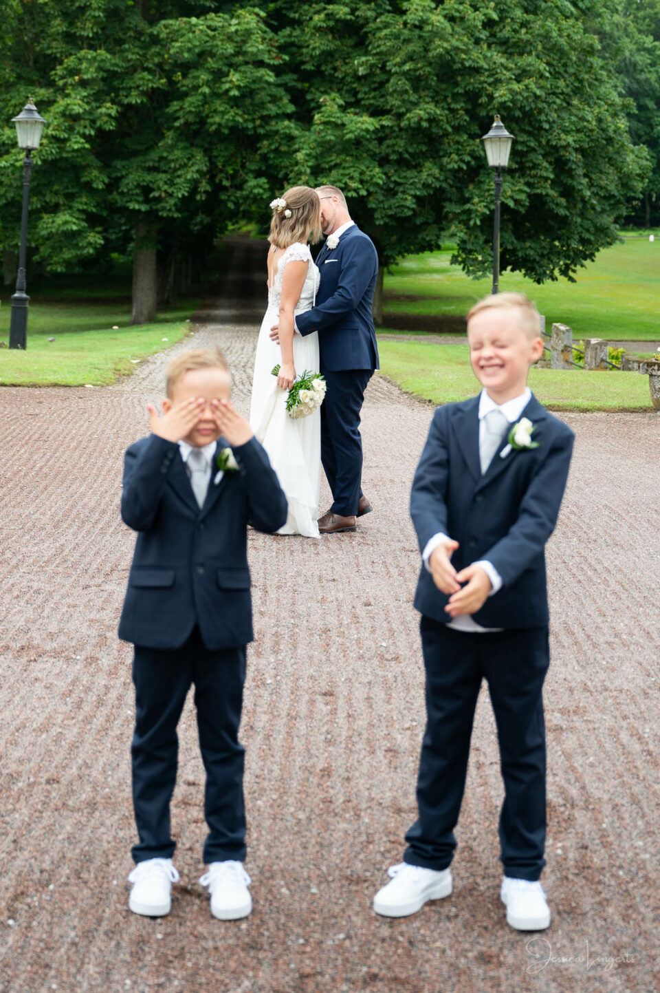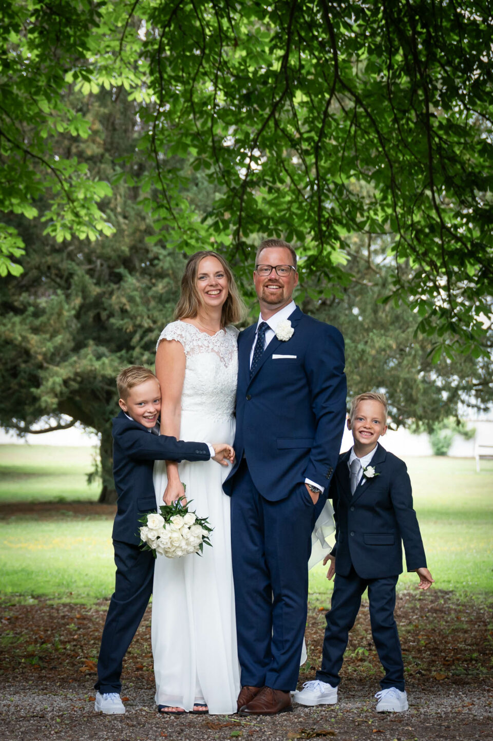 Brudparet Mette och Micke tillbringade natten före bröllopet på Ellinge Slott där festen sedermera skulle hållas. Jag kom lite tidigare än bestämt för att hinna fotografera Mettes förberedelser, därefter satte vi igång med porträttfotograferingen. Regntunga moln och duggregn till trots fick vi till världens härligaste fotografering. Vi började med First look och därefter tog vi oss runt i den fantastiska slottsparken. Efter ett tag anslöt även deras två härliga pojkar. Vigsel i Lilla Harrie Kyrka med präst Johanna Juhlin där stämningen var hög och skratten många. Mettes syster Petra sjöng underbart vackert i kyrkan, inte ett öga var torrt. Efter vigseln blev det lite körigt då jag behövde hålla ett paraply samtidigt som jag fotade brudparets entré och gratulationerna, regnet öste ner. Tillbaka till Ellinge Slott där mingel fick hållas inomhus, men även där var det feststämning från början till slut. Gruppfotograferingen togs i ösregn, men snabb som blixten var jag där uppe på stegen så brudparet och gästerna behövde inte stå där ute så länge. En fantastisk dag med ett underbart brudpar som inte överhuvudtaget lät sig påverkas av regnet!
