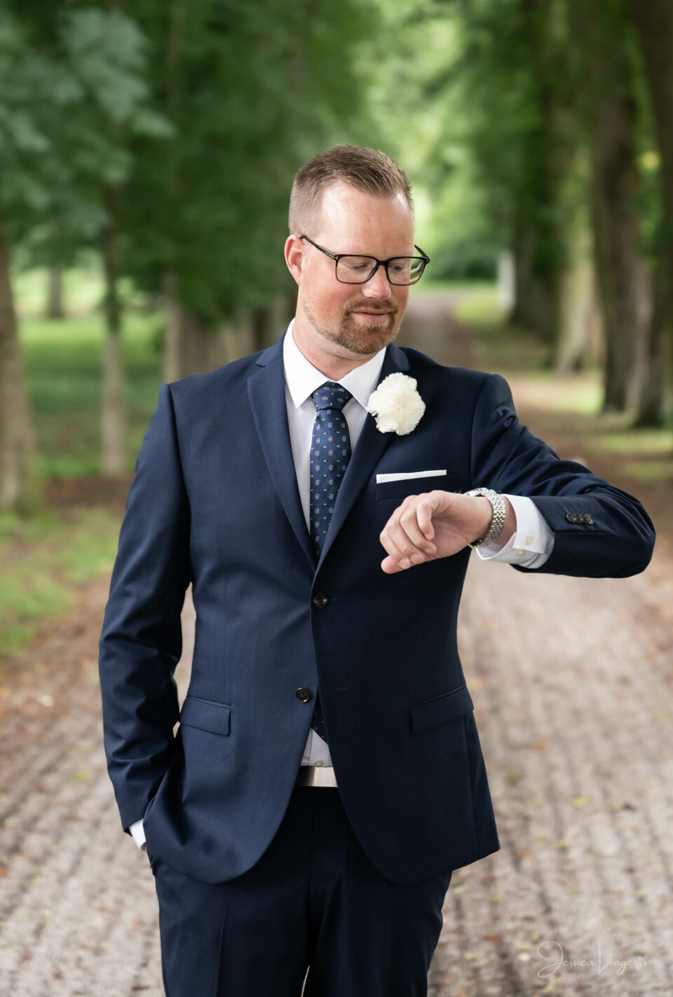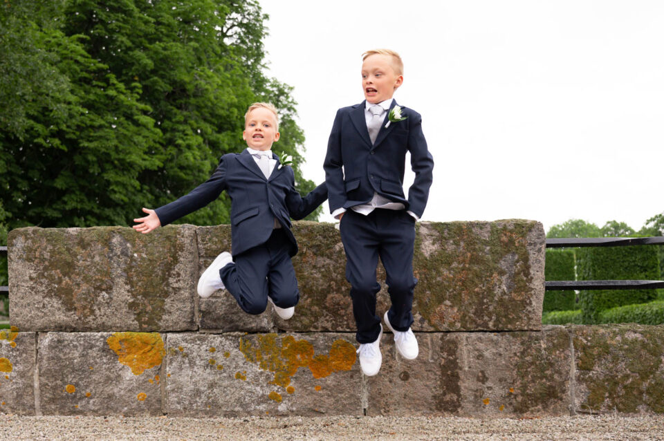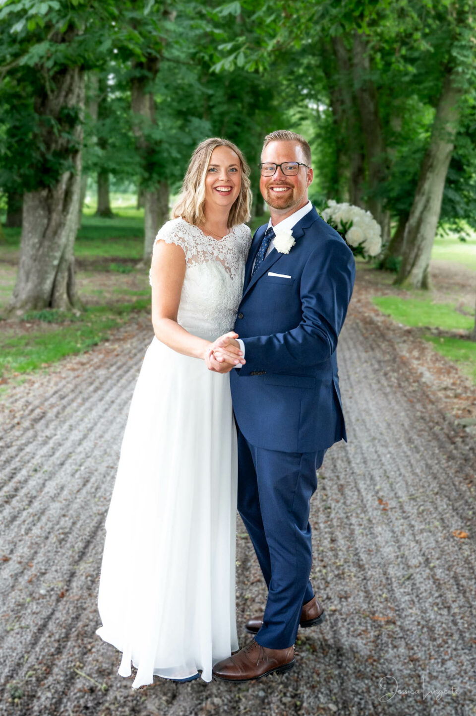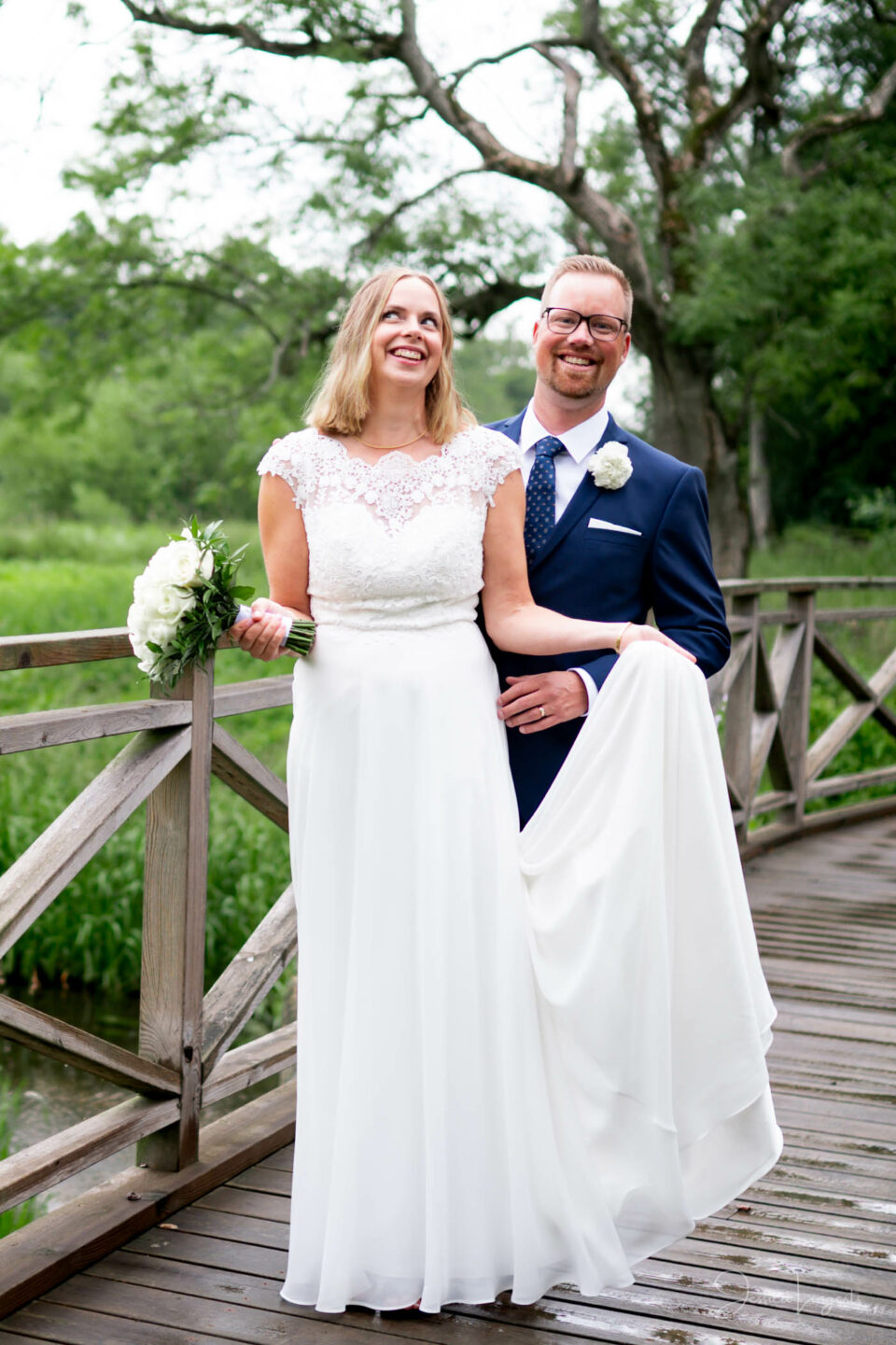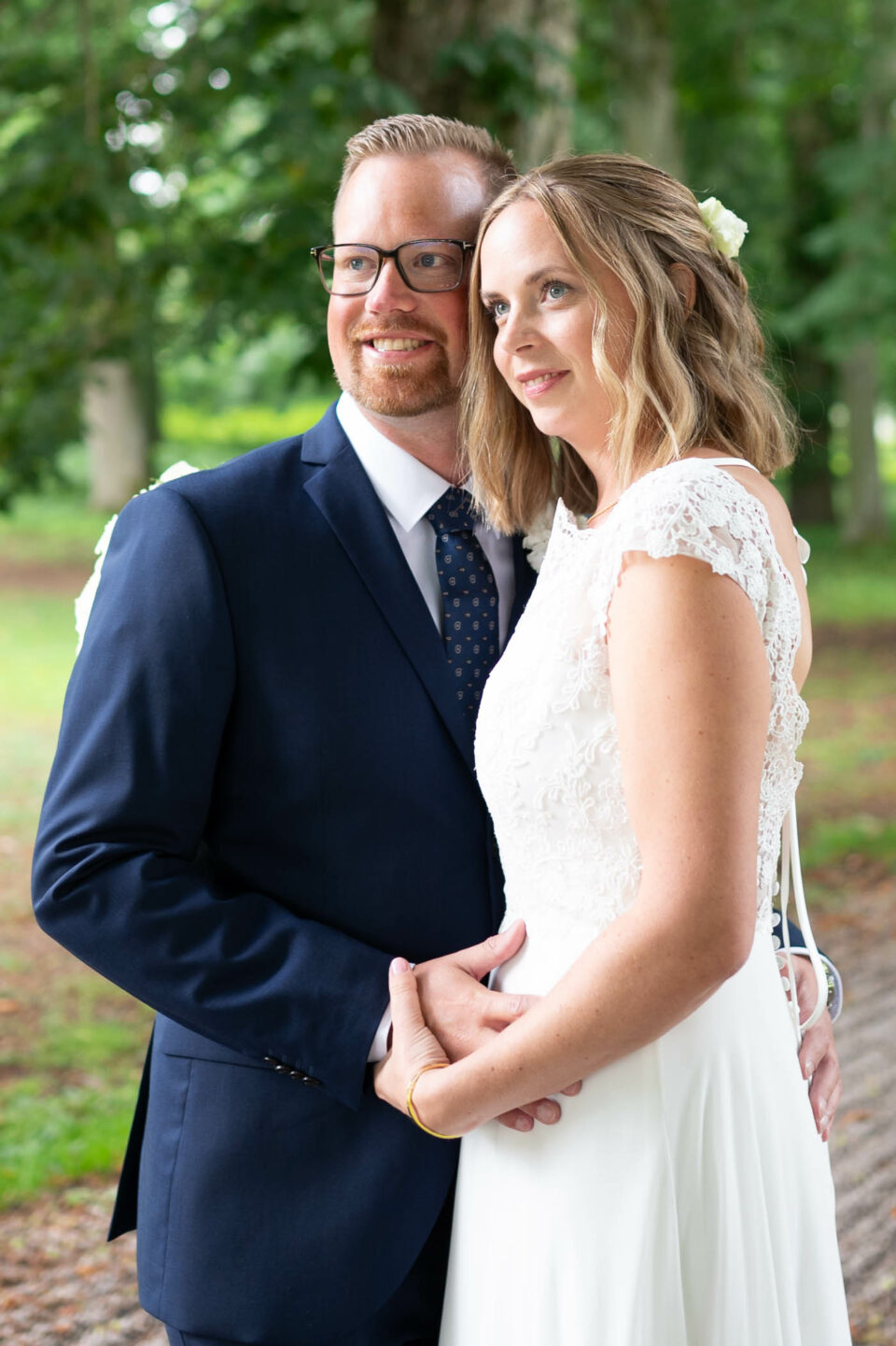 Brudparet Mette och Micke tillbringade natten före bröllopet på Ellinge Slott där festen sedermera skulle hållas. Jag kom lite tidigare än bestämt för att hinna fotografera Mettes förberedelser, därefter satte vi igång med porträttfotograferingen. Regntunga moln och duggregn till trots fick vi till världens härligaste fotografering. Vi började med First look och därefter tog vi oss runt i den fantastiska slottsparken. Efter ett tag anslöt även deras två härliga pojkar. Vigsel i Lilla Harrie Kyrka med präst Johanna Juhlin där stämningen var hög och skratten många. Mettes syster Petra sjöng underbart vackert i kyrkan, inte ett öga var torrt. Efter vigseln blev det lite körigt då jag behövde hålla ett paraply samtidigt som jag fotade brudparets entré och gratulationerna, regnet öste ner. Tillbaka till Ellinge Slott där mingel fick hållas inomhus, men även där var det feststämning från början till slut. Gruppfotograferingen togs i ösregn, men snabb som blixten var jag där uppe på stegen så brudparet och gästerna behövde inte stå där ute så länge. En fantastisk dag med ett underbart brudpar som inte överhuvudtaget lät sig påverkas av regnet!