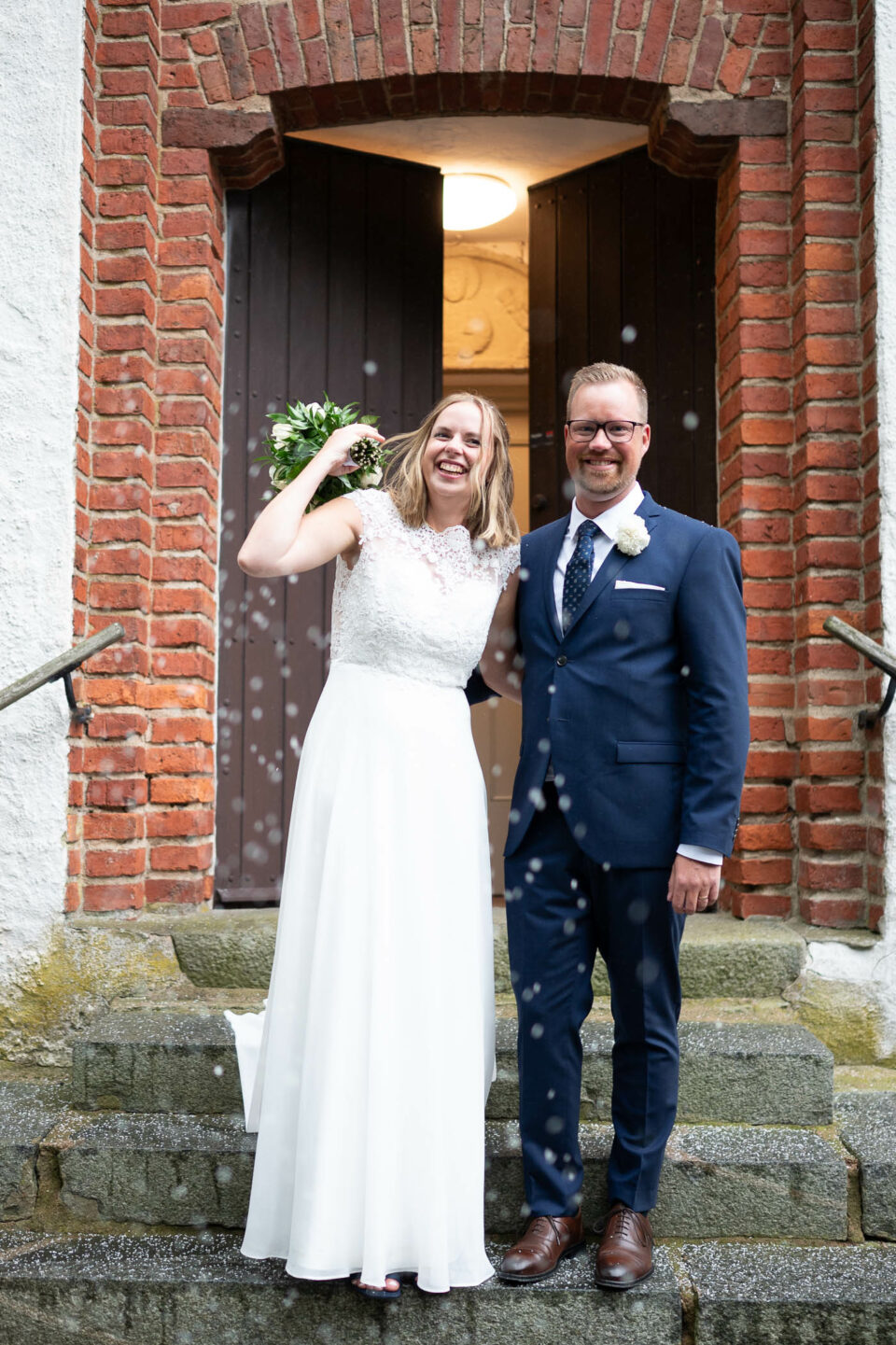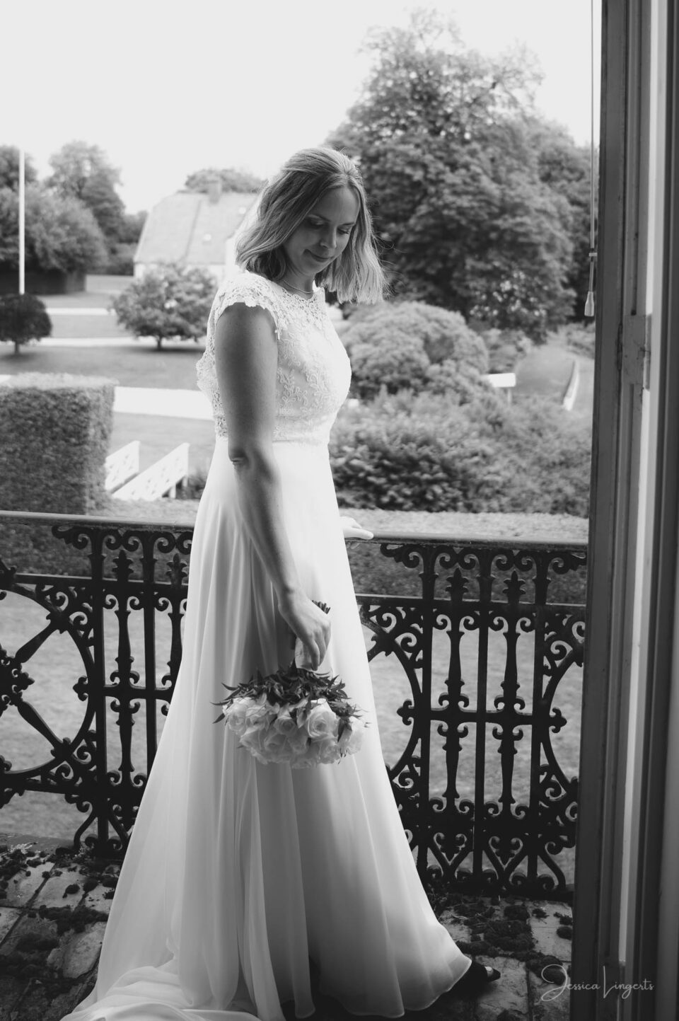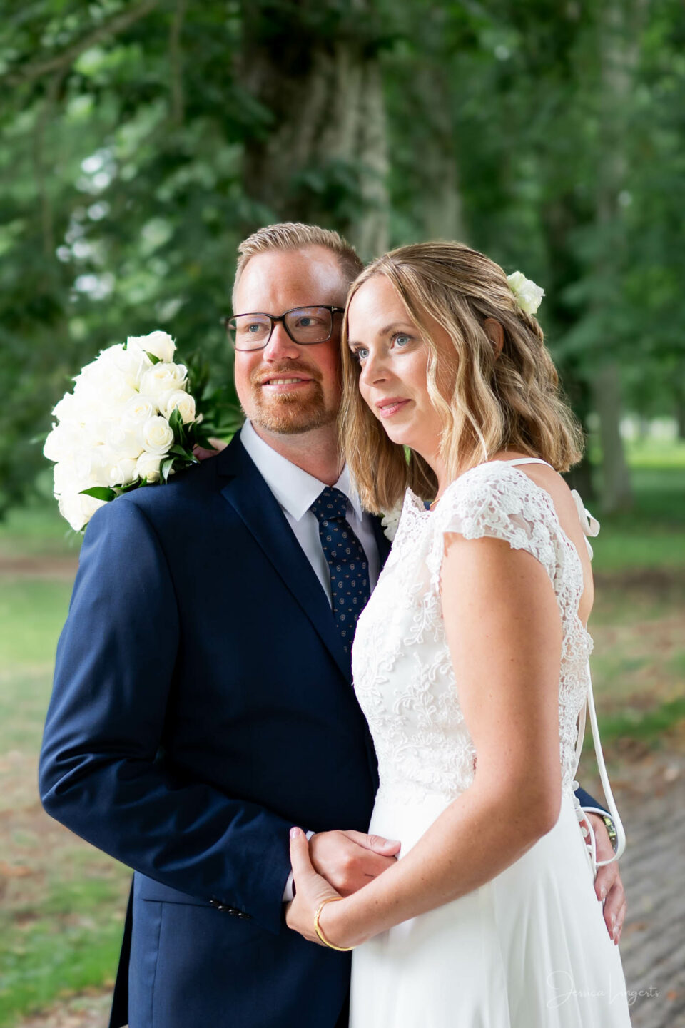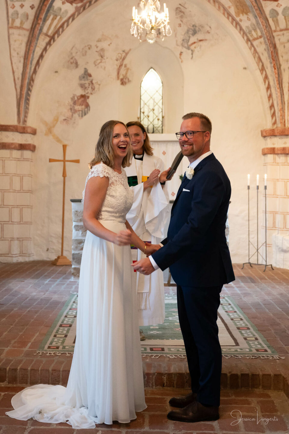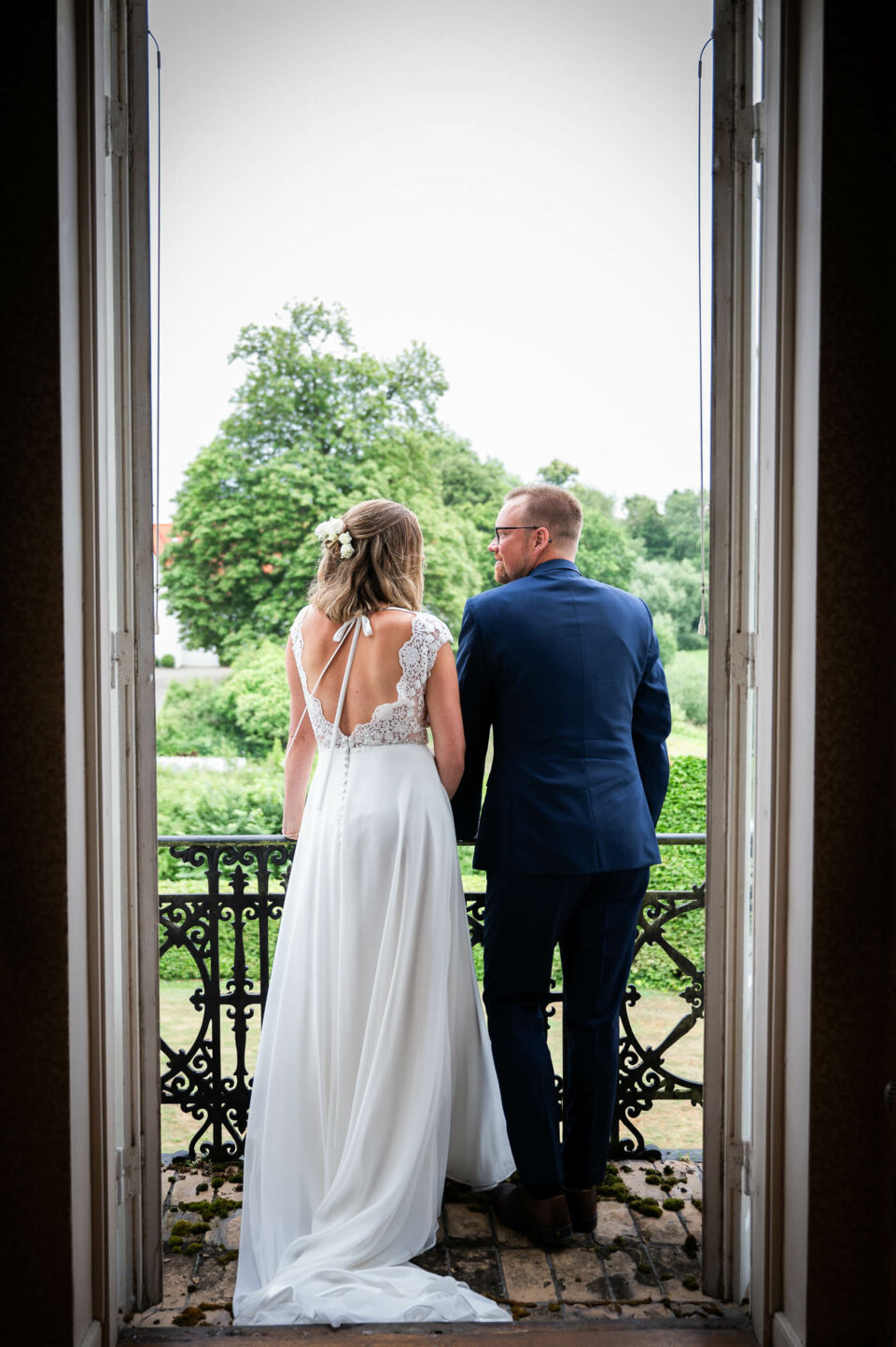 Brudparet Mette och Micke tillbringade natten före bröllopet på Ellinge Slott där festen sedermera skulle hållas. Jag kom lite tidigare än bestämt för att hinna fotografera Mettes förberedelser, därefter satte vi igång med porträttfotograferingen. Regntunga moln och duggregn till trots fick vi till världens härligaste fotografering. Vi började med First look och därefter tog vi oss runt i den fantastiska slottsparken. Efter ett tag anslöt även deras två härliga pojkar. Vigsel i Lilla Harrie Kyrka med präst Johanna Juhlin där stämningen var hög och skratten många. Mettes syster Petra sjöng underbart vackert i kyrkan, inte ett öga var torrt. Efter vigseln blev det lite körigt då jag behövde hålla ett paraply samtidigt som jag fotade brudparets entré och gratulationerna, regnet öste ner. Tillbaka till Ellinge Slott där mingel fick hållas inomhus, men även där var det feststämning från början till slut. Gruppfotograferingen togs i ösregn, men snabb som blixten var jag där uppe på stegen så brudparet och gästerna behövde inte stå där ute så länge. En fantastisk dag med ett underbart brudpar som inte överhuvudtaget lät sig påverkas av regnet!